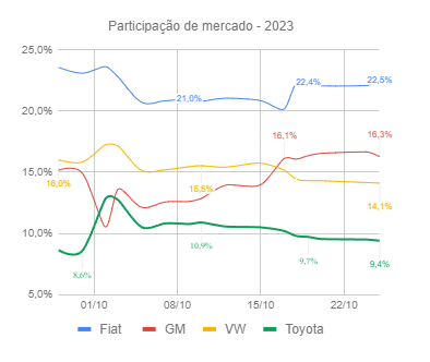Quando olhamos para o acumulado do ano, a Fiat mantém a liderança com 22,21% do mercado, com a GM seguindo de perto, retendo seus 16,3%.